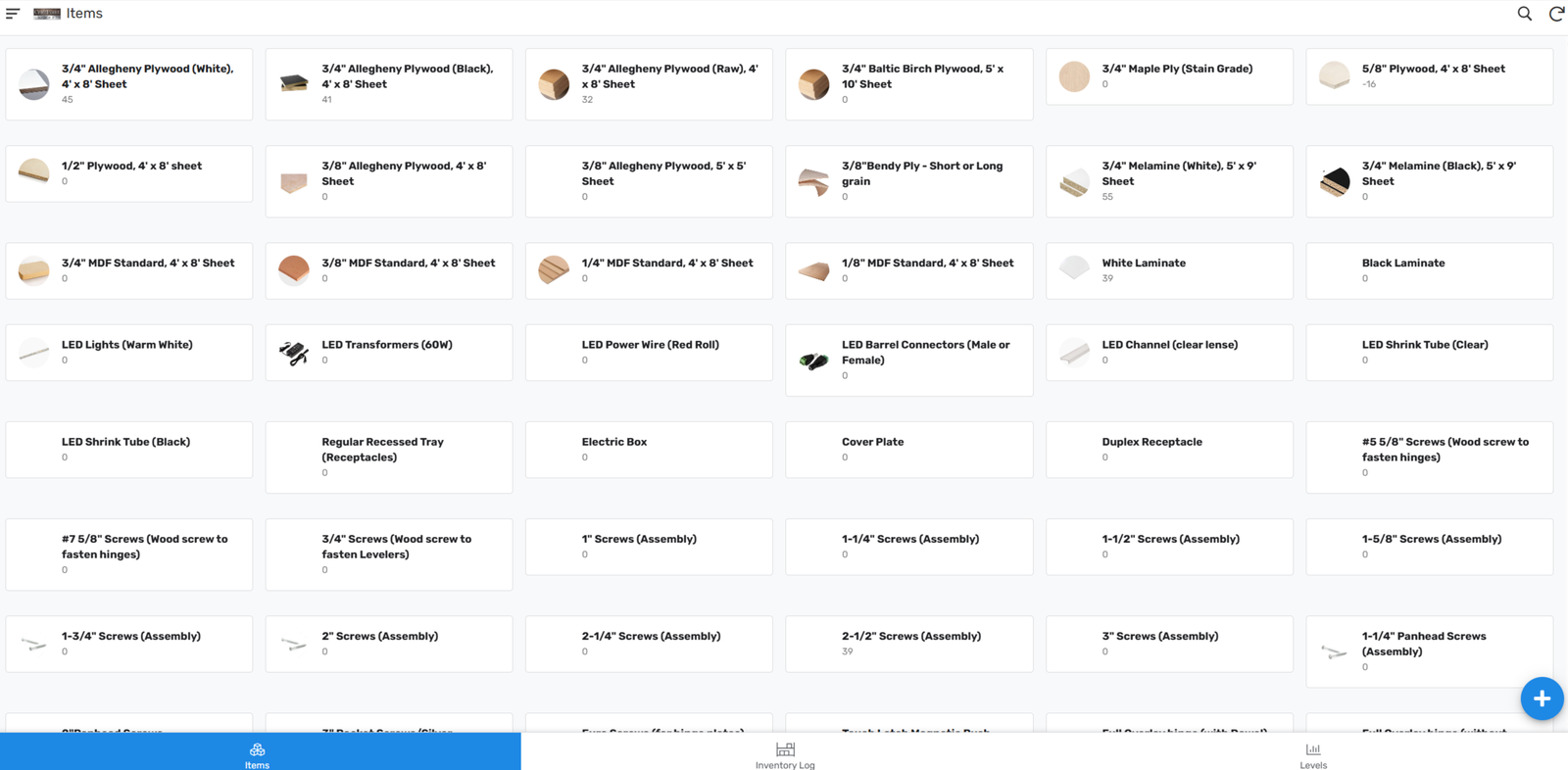 - Real-time stock levels: See your current quantities of lumber, fasteners, hardware, and upholstery supplies in one place.